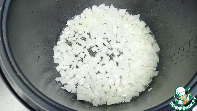 Отправляем в чашу масло и лук — Режим «Жарка» (t-160C) 10 минут (Не забываем перемешивать через 3-4 минуты).