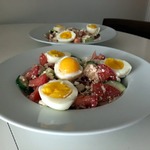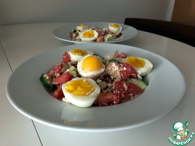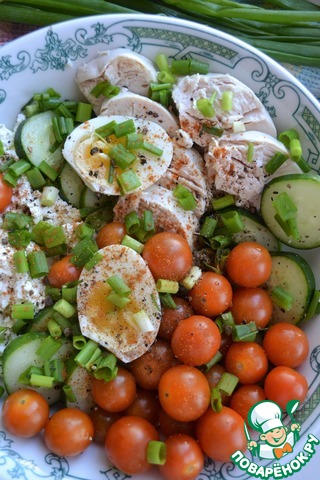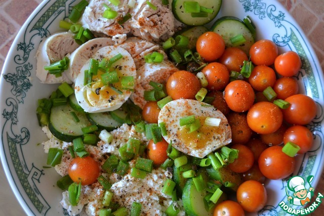 • В глубокую тарелку выложить творог, филе, яйцо, огурец, черри.