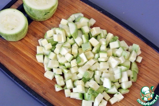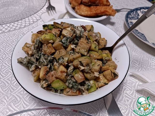 Добавить 1 чайную ложку сметаны. Можно сметану добавить и потом, когда выкладываются обжаренные кубики кабачка.