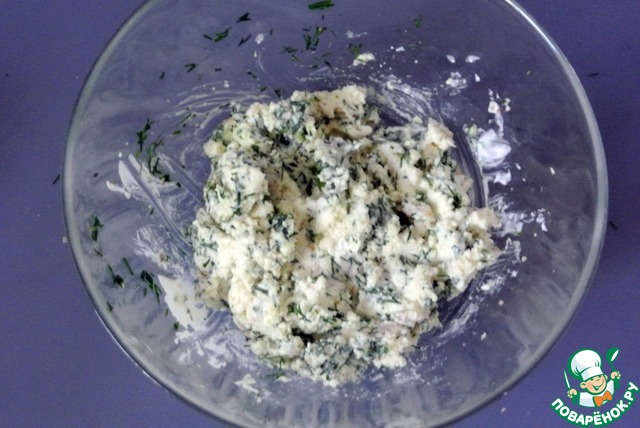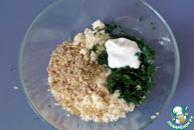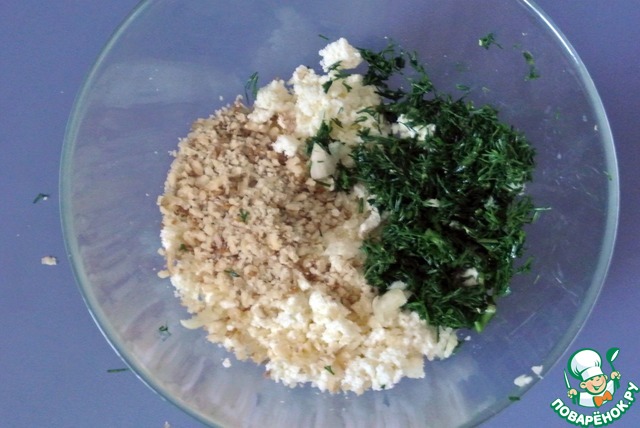 К размятому адыгейскому сыру добавить нарезанный укроп, грецкие орехи, чеснок, пропущенный через пресс.