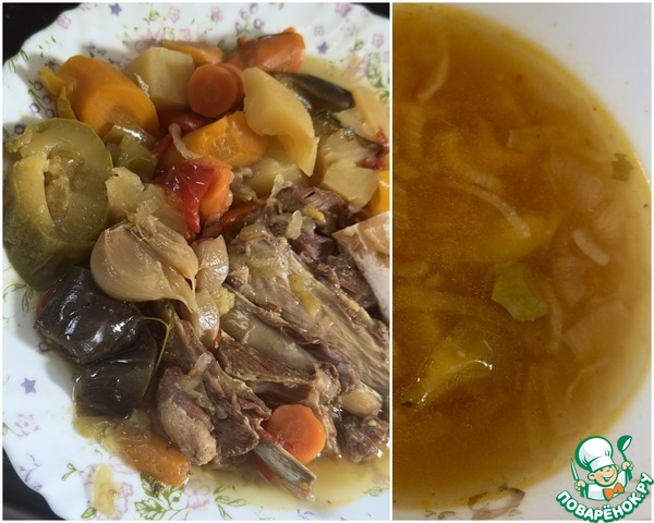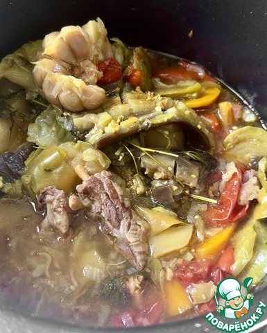 Мясо в овощном … «соусе», ну, никак не проходит, скорее в «соке». Настолько он, сок этот ароматен и чист. Не выдержал, конечно, ложкой зачерпнул – попробовал. Очень вкусно! Честное слово!