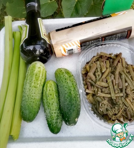 Шинкуем ревень и огурцы, папоротник по длине нарезать примерно в размер кубика огурца, заправляем соусами.