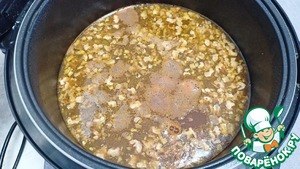 Добавляем в чашу мясо, пасту, ткемали, рис, бульон, специи и грецкий орех — Режим «Тушение» (t-110C) 30 минут.