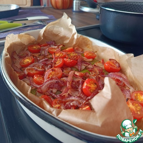 Сверху разложить бекон с луком.