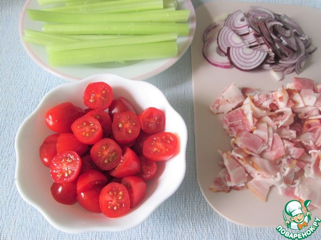 Сельдерей вымыть, разобрать на стебли и, при необходимости, разрезать на части. Я разрезала пополам, по размеру формы для запекания. Нарезать бекон на небольшие кусочки, красный лук – полукольцами, помидоры-черри – пополам.