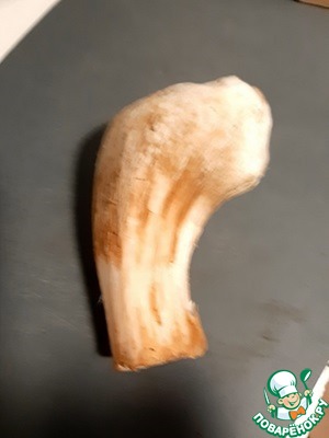 Приходим из леса, чистим грибы и отрезаем шляпу у царя леса. Нога около 15 см в длину и 5-6 см в диаметре в самом толстом месте.