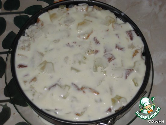 Берем форму для торта и начинаем собирать. Дно формы промазываем кремом и укладываем слой кубиков, я еще добавляла ананасы, они освежают.
