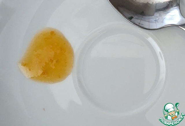 Опять доводим до кипения, только теперь при постоянном помешивании и на среднем огне (6 из 9), кипятим 1 минуту. Делаем тест на готовность, капаем чайную ложку на блюдце, если капля не растекается, готово, иначе варим ещё 1 минуту.