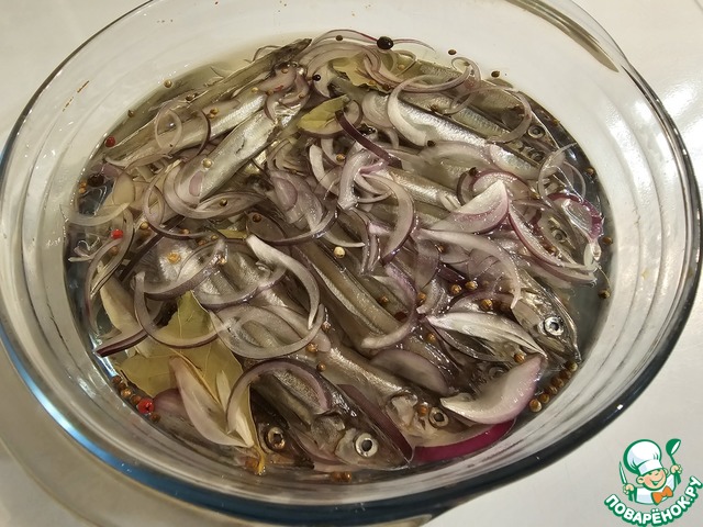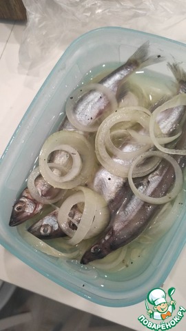 В контейнер или банку выложить часть лука и специй, сверху уложить плотно рыбу и посыпать половиной смеси из соли и сахара.