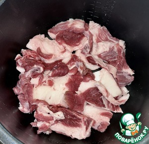 Жирную баранину или говядину (грудинку) обмыть, нарезать небольшими кусками, положить в кастрюлю и тушить 10 — 15 минут.