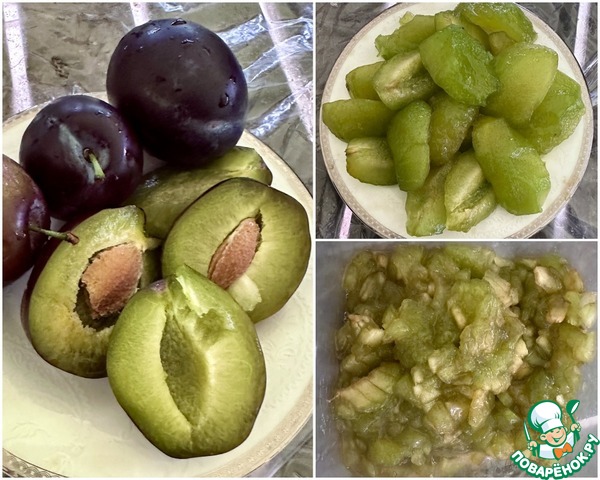Сливы. Ну нет уже зелёных, настоящих ткемали, увы. Купил вот такие. Они, конечно, сладковатые, но с хорошей такой кислинкой. Косточки удалил, почистил. Косточки и шкурки в супе – лишнее. Мелко нарезал и отставил до поры.