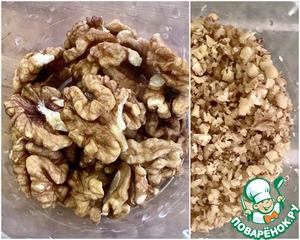 Орехи. Грецкие. Если берете чищеные – не забудьте промыть хорошо. Орехи можно немного просушить-прижарить на горячей сухой сковороде, чтобы ореховый аромат усилить. Я не стал. Да, если этого делать не будете, то дополнительно – не поленитесь, ошпарьте кипятком. И измельчить. Я мельчил ножом до состояния «крупки». Но можно и мельче сделать. Блендер или кофемолка помогут.