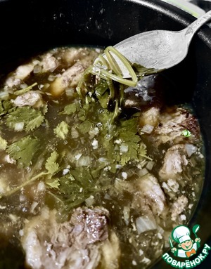 За 10 — 15 минут до окончания варки положить толчёный чеснок, мелко нарезанную зелень кинзы, стручковый и чёрный перец (истолчённый), соус ткемали или винный уксус (по желанию) и соль.