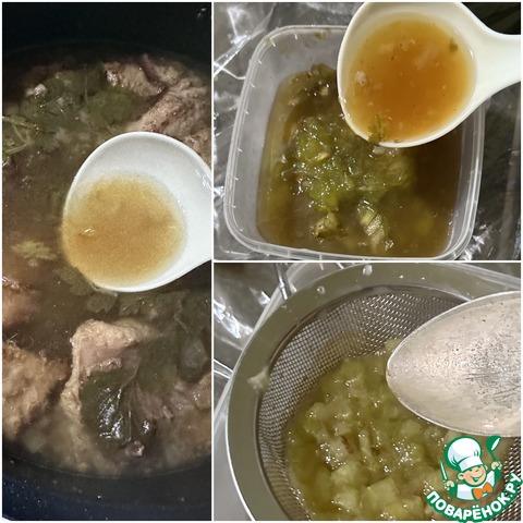Прежде всего из бульона извлечь ветки зелени. Я еще убрал все кусочки жира, ну лишнее это в супе. Вареный жир, хоть и говяжий, не сильно вкусно. И кости, конечно, тоже вынул.