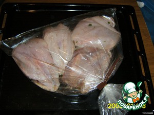 Начиненные грудки складываем аккуратно в пакет для запекания и ставим в духовку.
