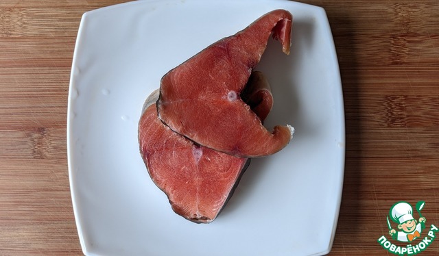 Для приготовления берём любую рыбу лососевых пород. У меня - сима. Чистим. Режем на куски. Готовим любым способом: варим в воде или на пару, запекаем в фольге. Я отварила 15 минут.