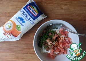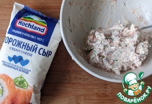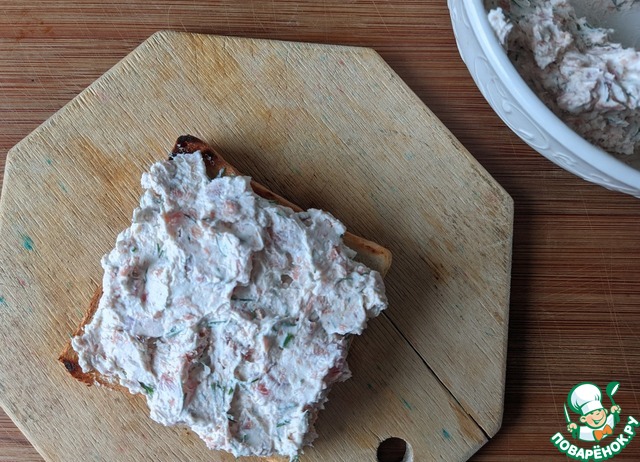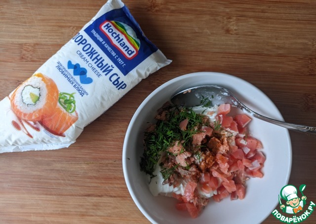 Готовую вареную остывшую рыбу разминаем на маленькие кусочки. Малосольную рыбу режем мелкими кубиками. Кладём к творожному сыру. Туда же кладём рубленный укроп и паприку. Или по желанию карри.