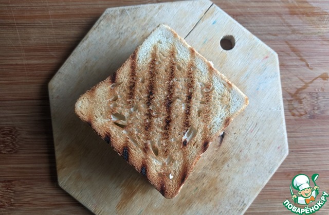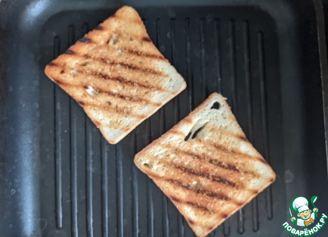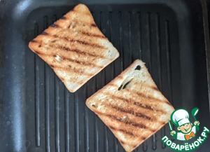 Тостовый хлеб поджариваем в тостере или на сковороде-гриль с обеих сторон.