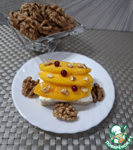 Сверху уложить ломтики манго.