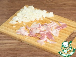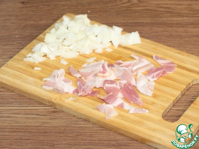 2. Нарезаем грудинку полосками и очищенный лук - кубиками.