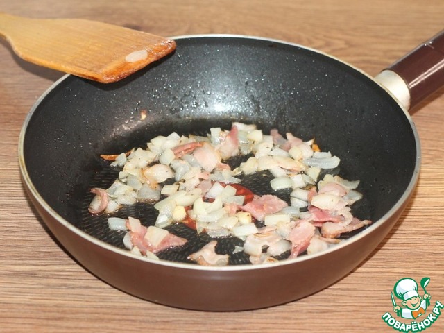 3. На разогретом растительном масле обжариваем лук и грудинку, минуты 3.