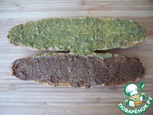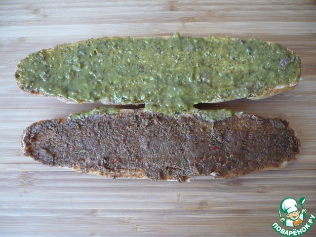 Намажьте одну сторону булки красным соусом песто, а другую-зеленым соусом песто.