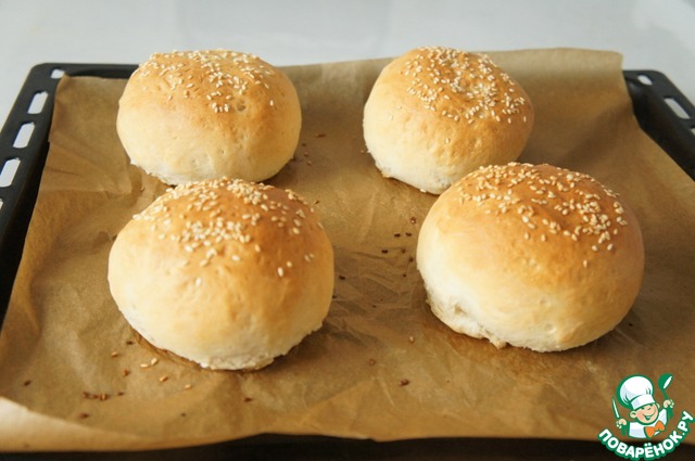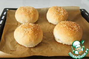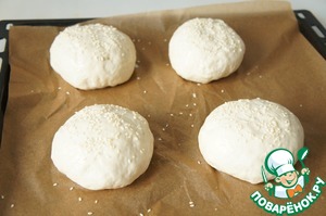 Накрываем полотенцем, даём постоять минут 20. Нагреваем духовку, смазываем булочки молоком, присыпаем кунжутом. -