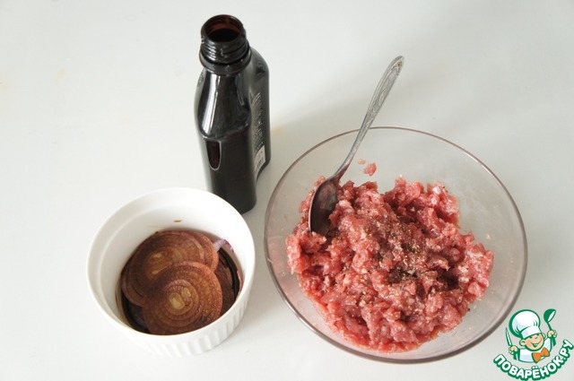 Фарш используем говяжий с жирком. По классике в фарш лук не кладут, но я добавляю четвертинку луковицы на тёрке, так получается ещё сочнее. Отправляем в фарш лук, свежемолотый чёрный перец и полчайной ложки жидкого дыма.