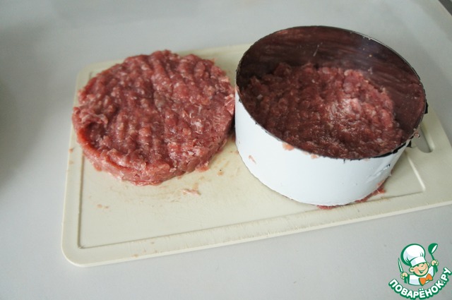 Затем формируем 3 котлеты при помощи кондитерского кольца. Важно, чтобы котлеты получались больше, чем булки, мясо потом ужарится. -