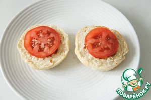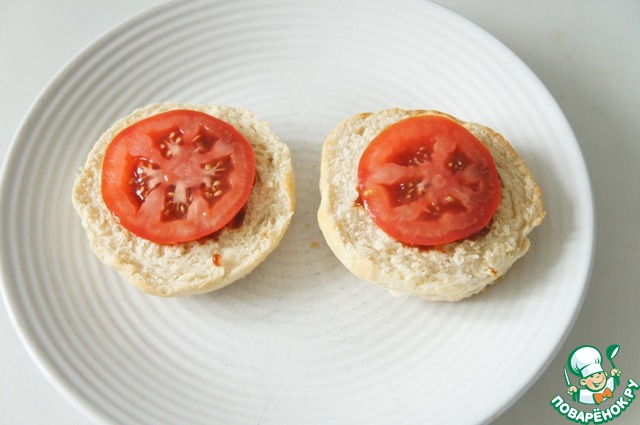 Смазываем чайной ложкой соуса барбекю, кладём ломтик помидора.