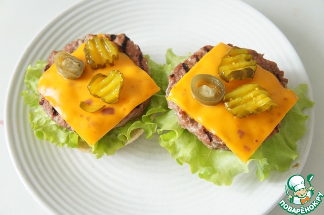 Затем котлету с сыром, кружочек перца чили, пару кружков маринованного огурчика (у меня домашние от мамы).
