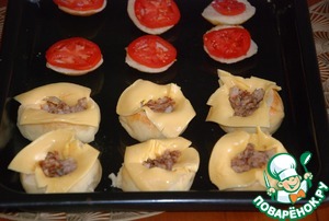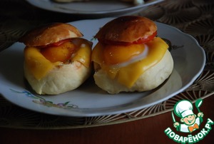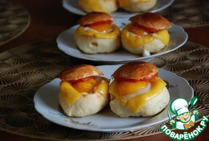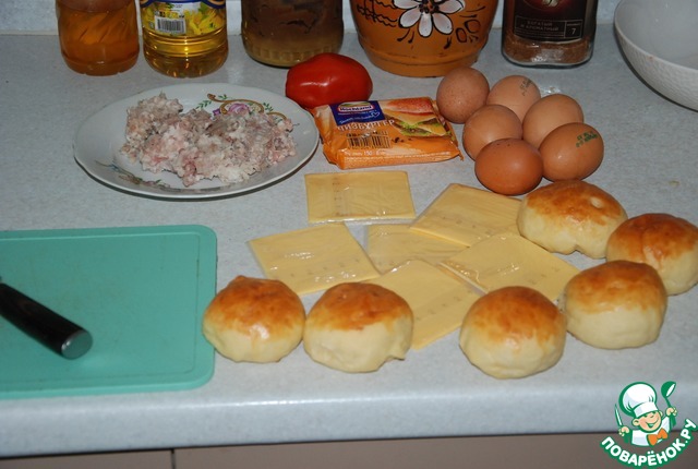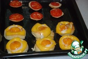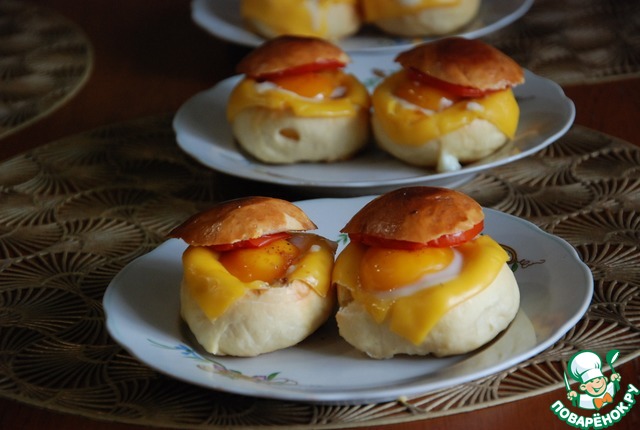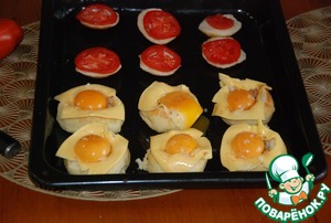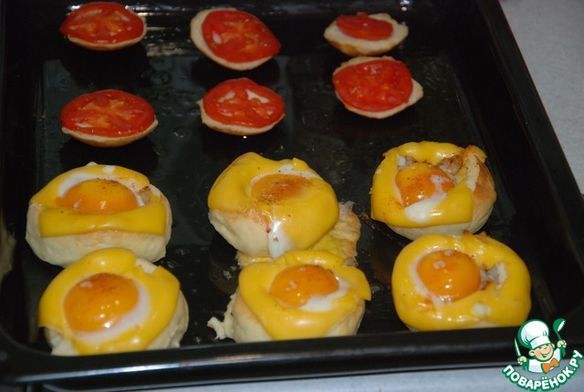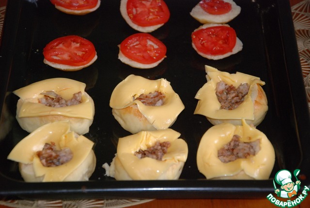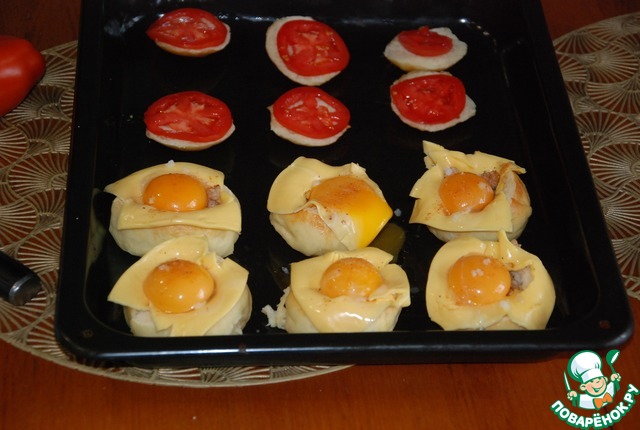 Положить в булочки на сыр обжаренный фарш. Необходимо оставить место для желтка. Выложить все на противень. Крышечки выложить срезом вверх, положить на них по слайсу помидорки.