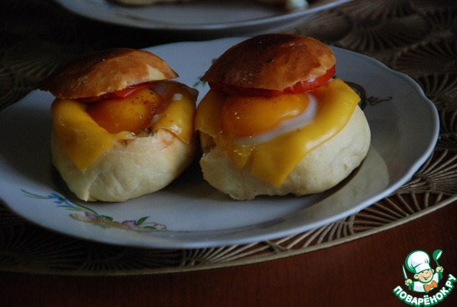 Аккуратно выложить в каждую булочку желток. Посолить его и поперчить. Белки нам в этом рецепте не понадобятся. Отправить противень в духовку на 10-15 минут. Нам нужно, что-бы желток остался жидким. Ориентируйтесь по остаткам белка. Как они побелеют - готово.