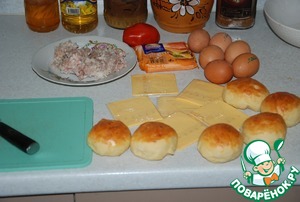 Подготовьте набор продуктов для булочек. Я использовала плавленый сыр Hochland "Чизбургер". Он отлично подходит для данного рецепта. Поставьте разогреваться духовку на 190 гр. Помидор нарежьте слайсами. Сковороду смажьте растительным маслом и поставьте на плиту. Смажьте растительным маслом противень.