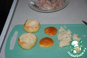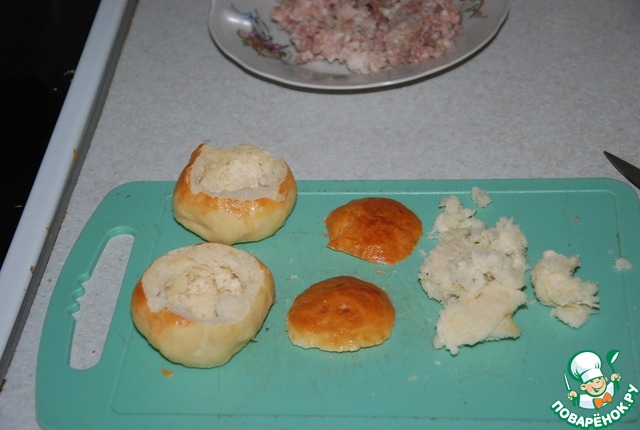 Срежьте с булочек макушечки и удалите мякиш. Фарш посолите и поперчите хорошенько помешайте.