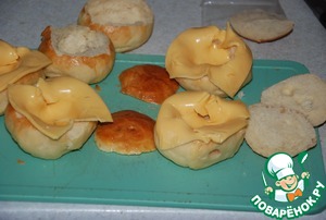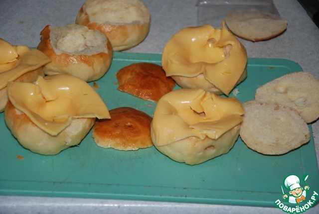 Выложить в булочки пластинки сыра. Расправить сыр по бокам нашей булочки. Он очень пластичный и сделать это совсем не сложно.