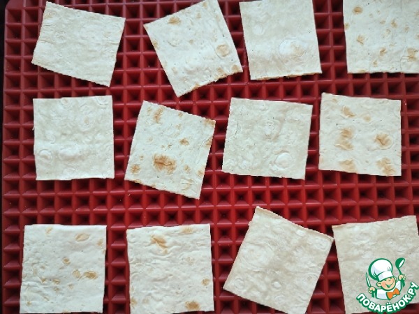 Лаваш нарезаем на квадраты около 5 см. И отправляем в разогретую до 200* духовку, немного их подсушиваем (это происходит очень быстро, не упустите момент).