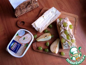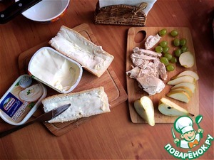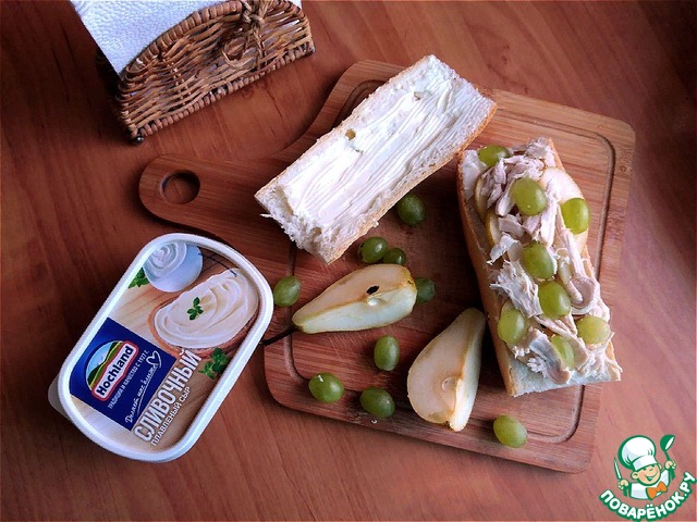 Щедро намазываем обе половинки багета сливочным плавленным сыром. Куриную грудку нарезаем на куски или разберём на волокна. Грушу нужно разрезать, освободить от семян и нарезать на тонкие слайсы. Груша должна быть мягкой, сочной, спелой и сладкой. Виноград режем на 2 половинки. Лучше брать без косточек.