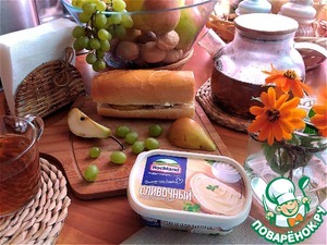Накрываем верх второй половинкой промазанного сыром багета, это если вы захотите сделать сэндвич. Все составляющие сэндвича отлично прилипнут к сыру и сэндвич не развалится.