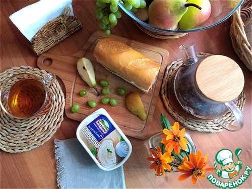Если неудобно вам будет есть, то снимите верхний кусок багета, на нём останется половина всех составляющих сэндвича, благодаря плавленному сыру. У вас будет два бутерброда. Я заварила зелёный чай с кипреем. Быстрый перекус.