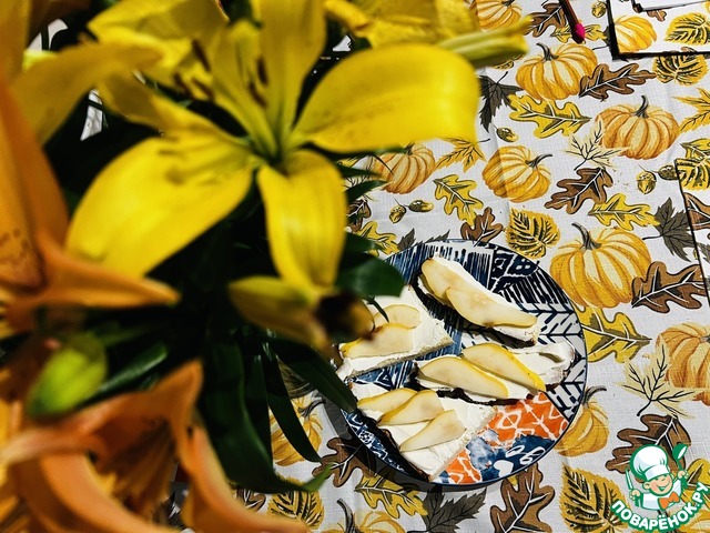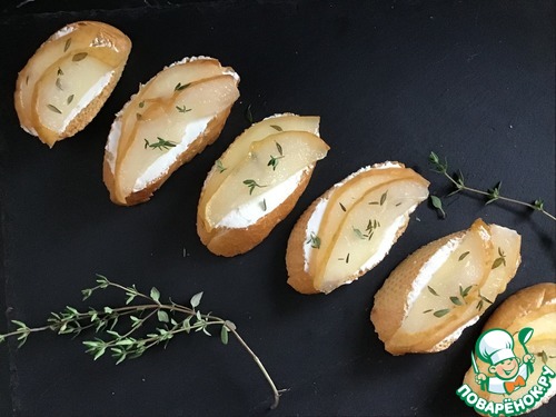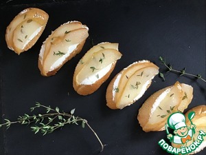 Сверху на сыр поместите по 2 ломтика груши. Можно дополнительно полить медом и украсить тимьяном.