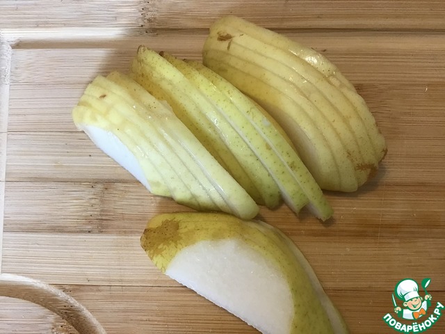 Помойте и обсушите груши. Разрежьте их вдоль на четвертинки. Удалите семена и грубые части, тонко нарежьте. Чтобы груши не потемнели, можно сбрызнуть их лимонным соком. Не волнуйтесь, вкус лимона вы не почувствуете.