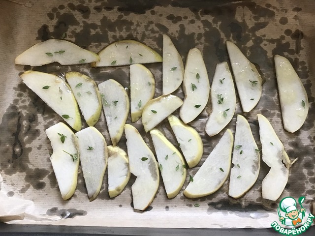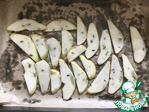 Противень застелите пергаментом и выложите дольки груш. Присыпьте листиками тимьяна и полейте медом. Запеките в течение 15 минут в духовке, разогретой до 180 градусов. Выньте из духовки и остудите.