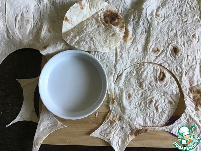 Из лаваша вырезать круги диаметром 12 см. Накрыть влажным полотенцем, чтобы легче было сформировать корзиночки и лаваш не ломался. -
