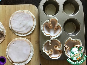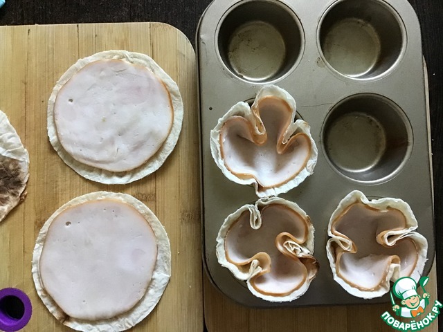 На каждый круг лаваша выложить тонкий ломтик ветчины и аккуратно вложить в отверстие для выпечки маффинов, формируя корзиночку. -