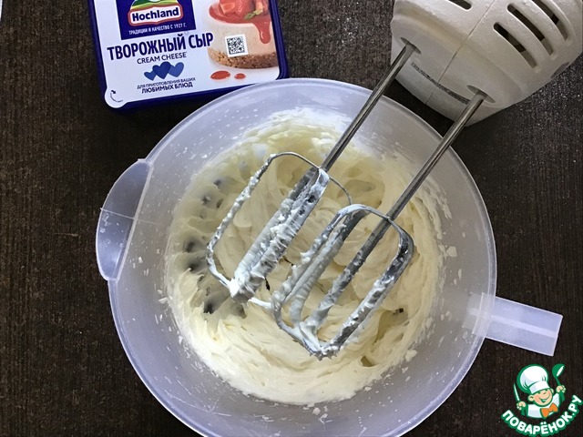 Для этого в миску добавить сыр творожный Hochland Сream cheese, сахарную пудру и ванильный экстракт, взбить венчиком или при помощи миксера до пушистой массы. Отставить в сторону.