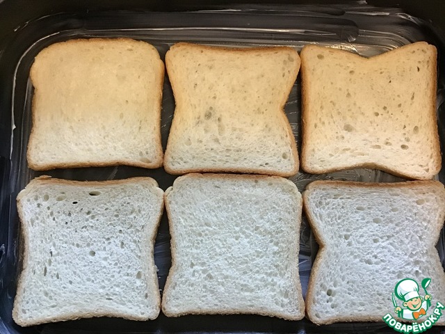 Смазать форму для выпечки размером 23x33 см сливочным маслом. Выложить на дно формы 6 ломтиков хлеба. Я использовала тостовый нарезной хлеб, что очень удобно.