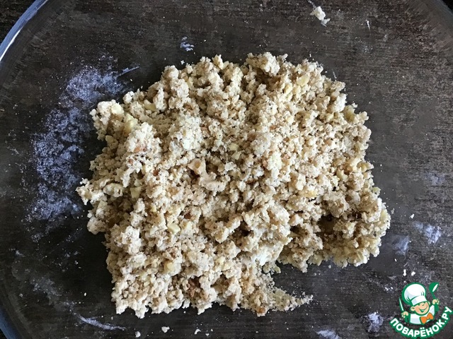 В средней миске смешайте муку, коричневый сахар, корицу и соль. С помощью блендера или пальцев перемешайте масло с мучной смесью, пока она не станет напоминать крупный песок. Добавьте рубленные орехи, если используете. Перемешайте, накройте пленкой и уберите в холодильник. -