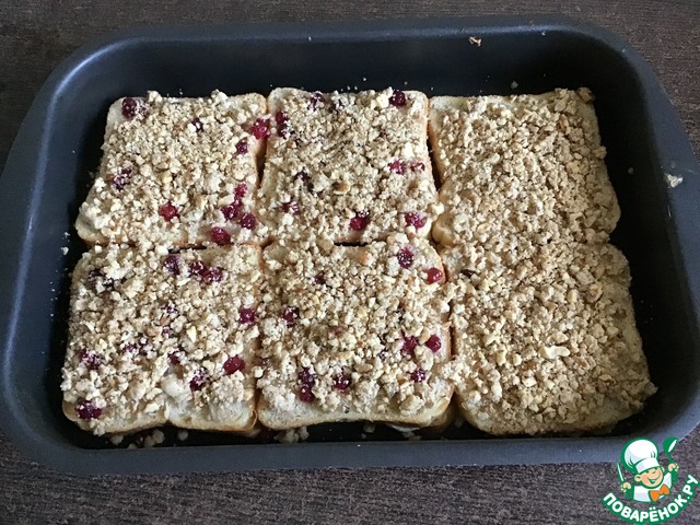 Форму с тостами выньте из холодильника, снимите пленку и равномерно посыпьте французские тосты штрейзелем.