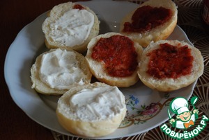 Перед тем, как перевернуть котлеты - отправляем булочки в микроволновку на 30 секунд на разогрев. У меня обычно есть ассистент (главный поклонник бургеров домашних), который этим занимается. Низ булочек нужно смазать сырным соусом, а верх - томатным соусом. По готовности котлет, все это должно быть готово, разогрето и намазано.